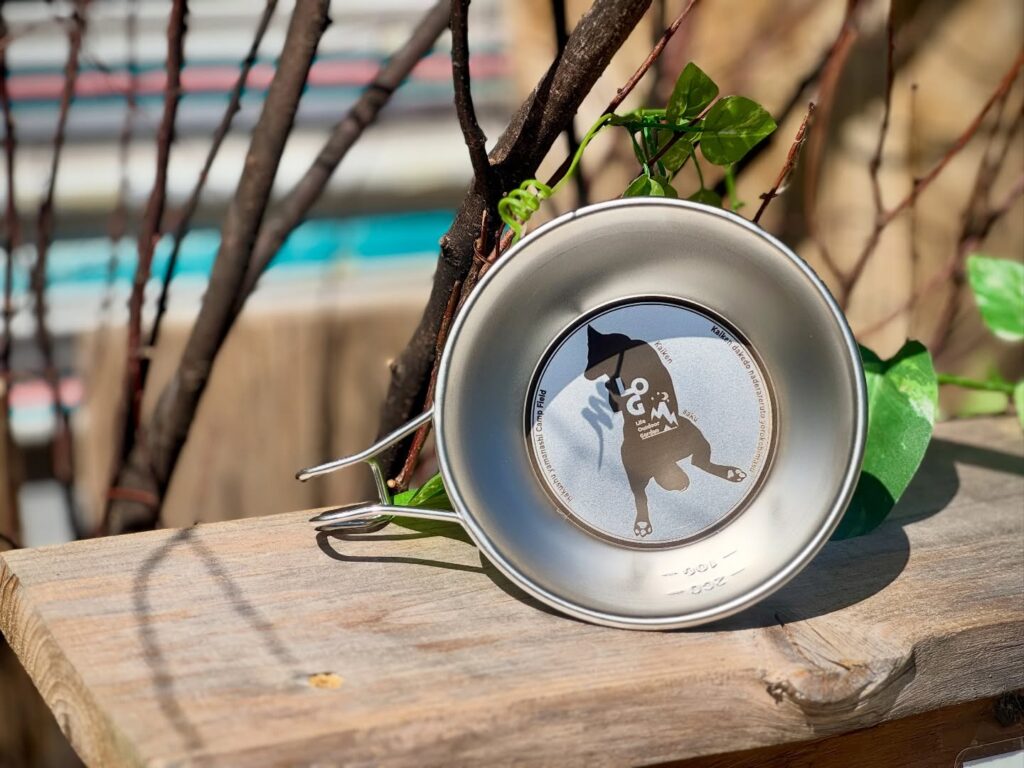 Life outdoor gardenオリジナルシェラカップ(看板犬サクVer)を、友人 @shikata.k0916 が作って来てくれました!!